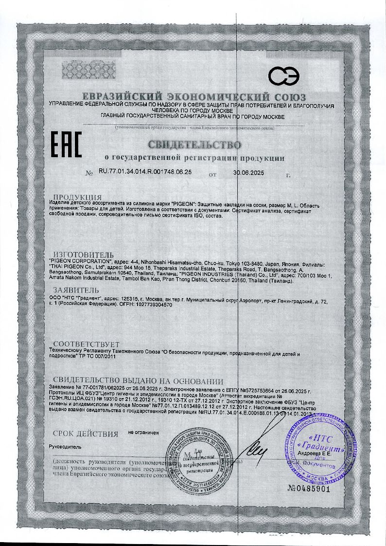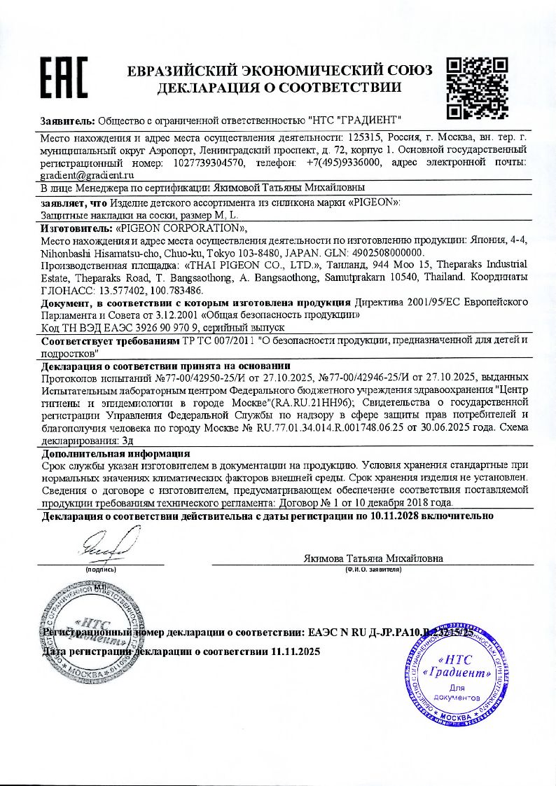 • Сертификаты и лицензии “Pigeon 2 шт накладка защитная на соски для кормления размер L”
