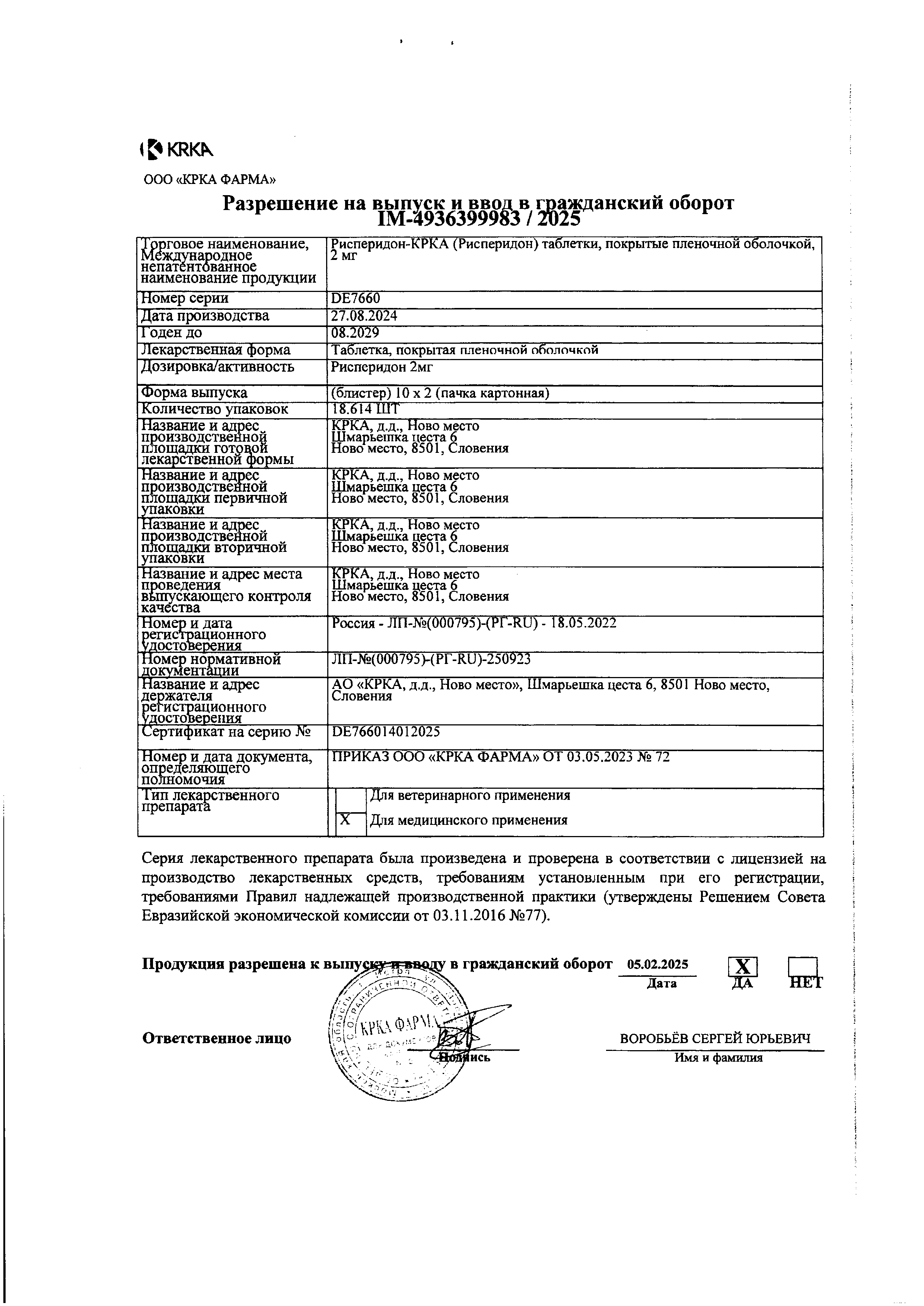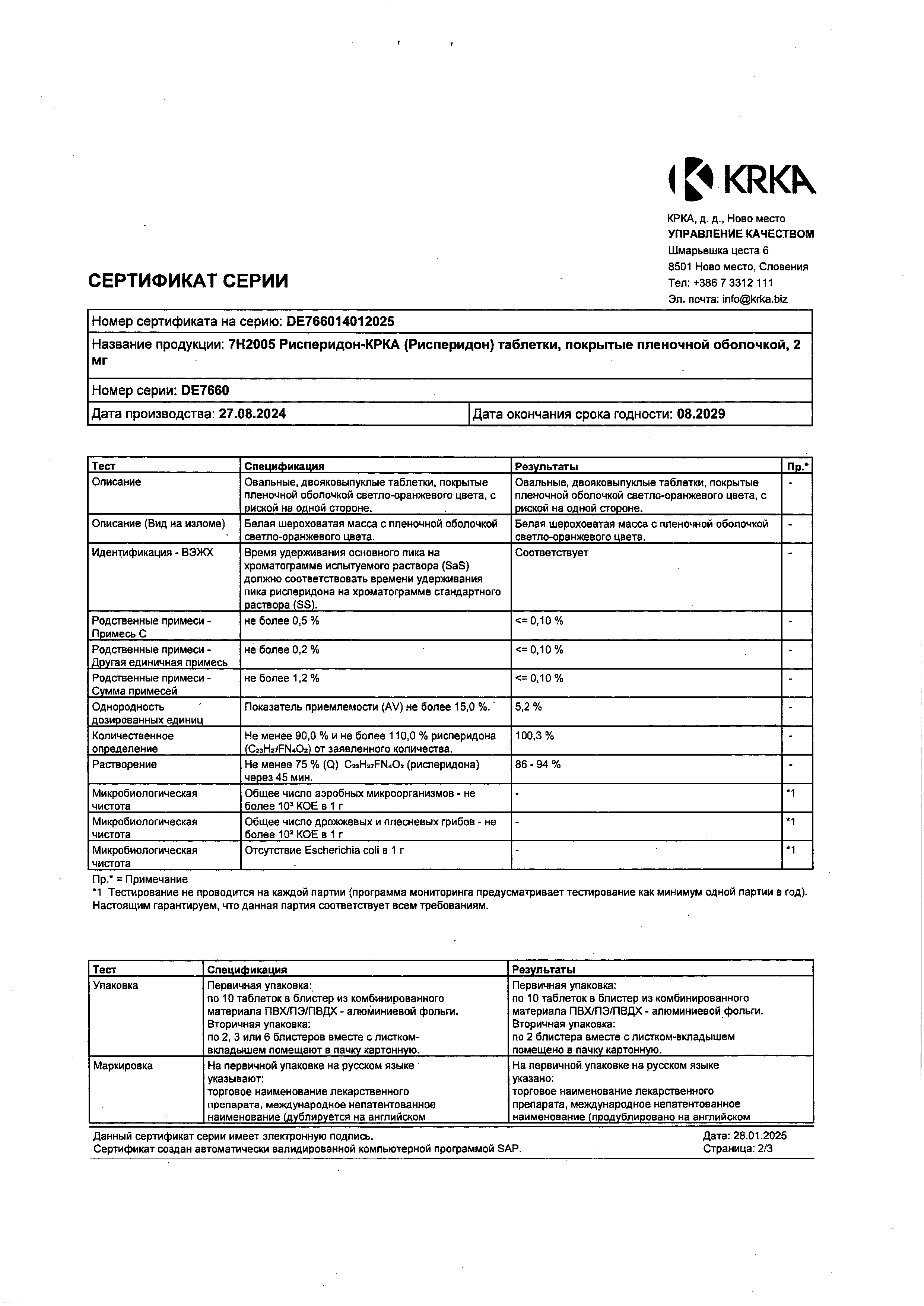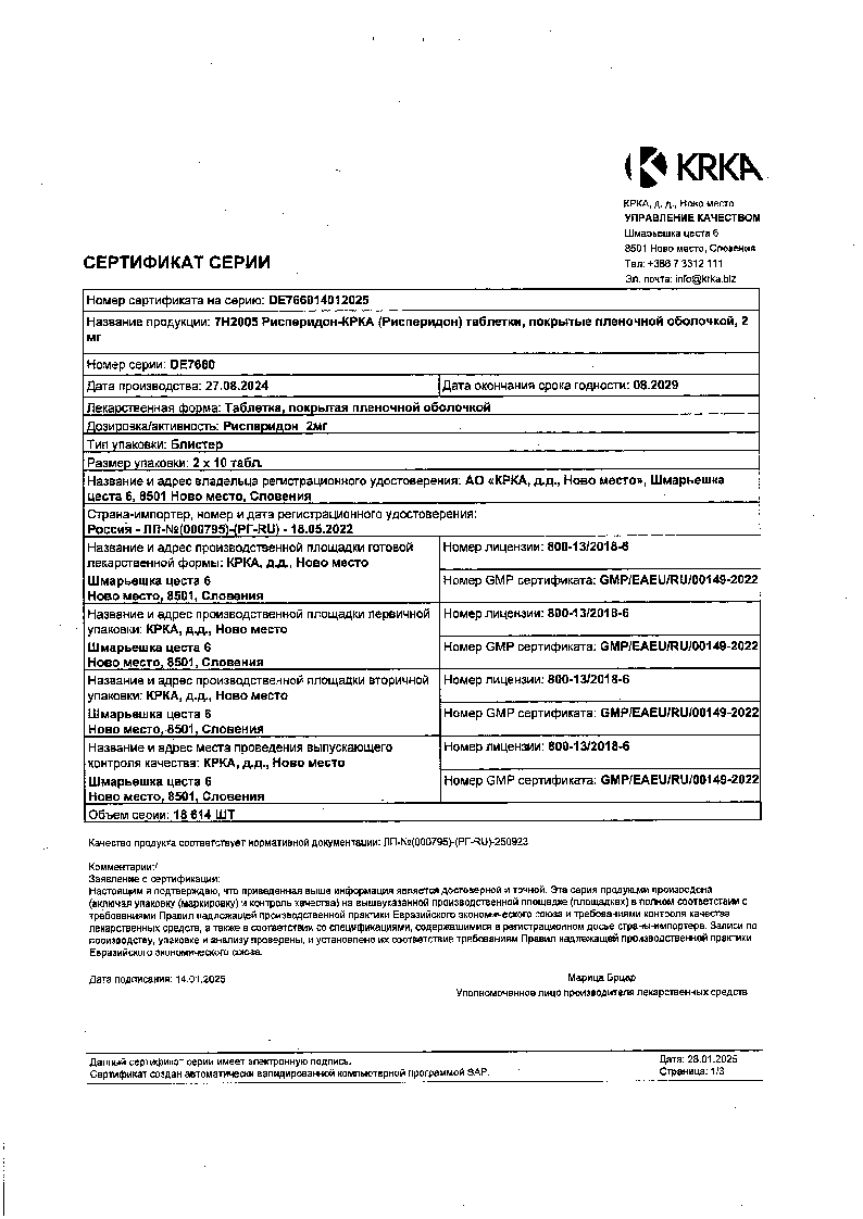 Сертификаты и лицензии “Рисперидон-КРКА 2 мг 20 шт таблетки покрытые пленочной оболочкой”