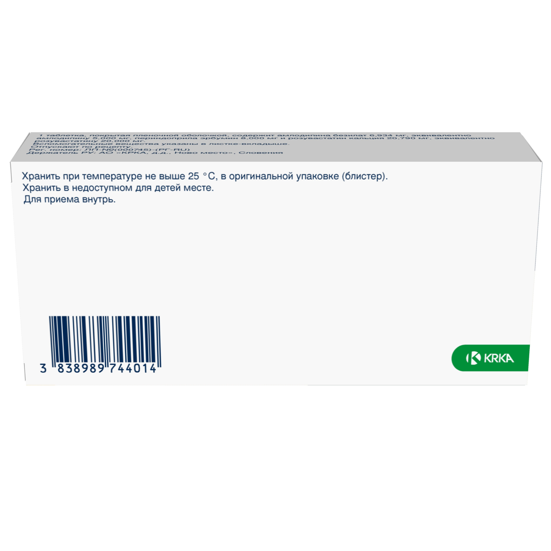 Действующими веществами являются: амлодипин, периндоприл и розувастатин. Каждая таблетка содержит 6,934 мг амлодипина безилат, эквивалентно амлодипину 5 мг, 8 мг периндоприла эрбумин и 20,79 мг розувастатина кальция, эквивалентно розувастатину 20 мг. Прочими ингредиентами (вспомогательными веществами) являются: Ядро Целлюлоза микрокристаллическая, тип 200, целлюлоза микрокристаллическая, тип 112, кросповидон, тип А, кремния диоксид коллоидный безводный, магния стеарат Пленочная оболочка Пленкообразующая смесь №2: поливиниловый спирт, макрогол 3350, титана диоксид (Е171), железа оксид желтый (Е172), тальк.