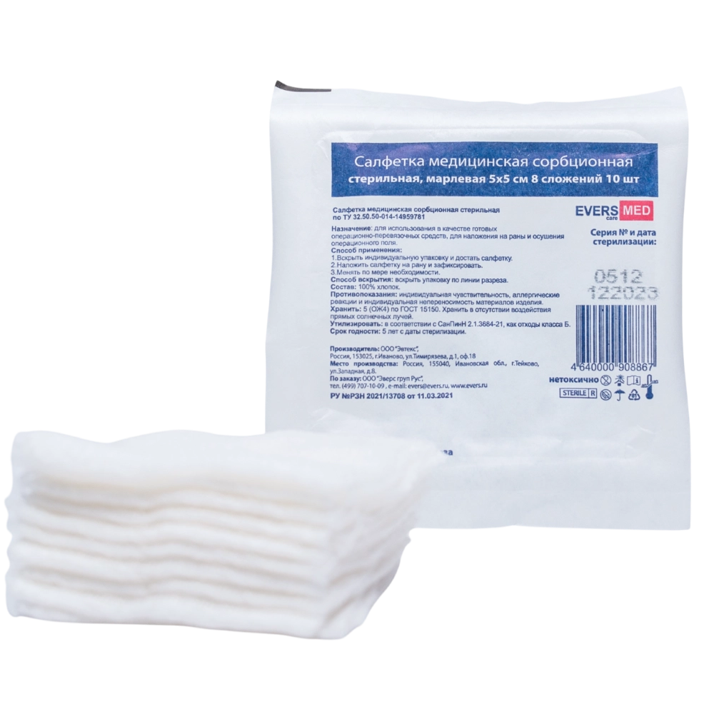 САЛФЕТКИ МЕДИЦИНСКИЕ СОРБЦИОННЫЕ СТЕРИЛЬНЫЕ МАРЛЕВЫЕ ДВУХСЛОЙНЫЕ /EVERS LIFE - для обеспечения полной безопасности края салфеток сложены внутрь.