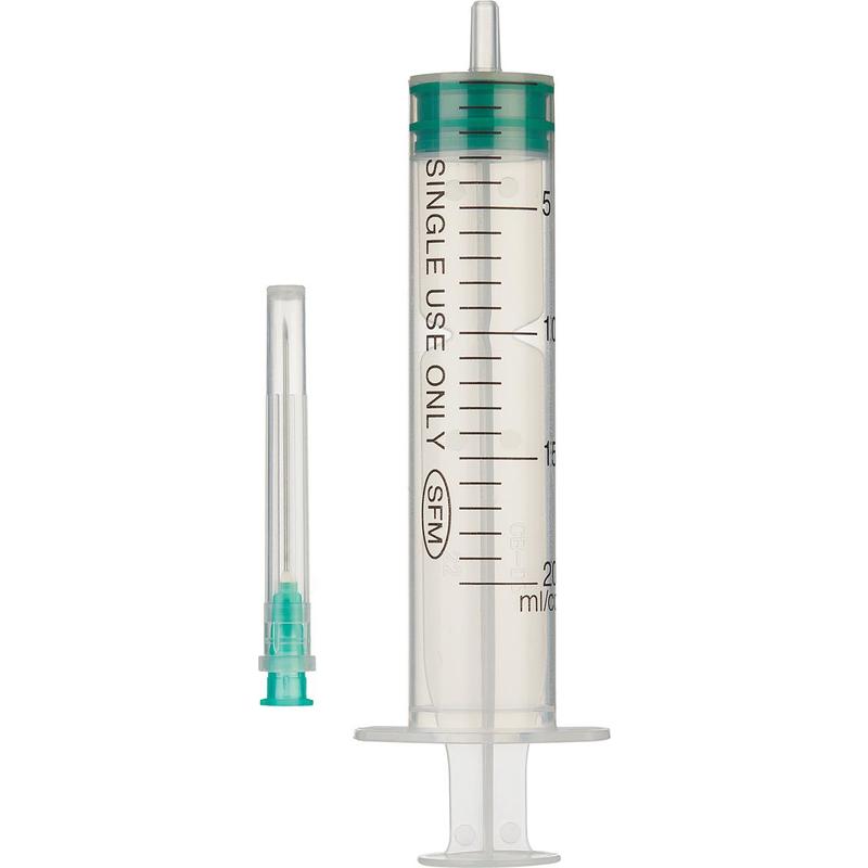 Шприц трехкомпонентный SFM 20 мл 21G (0.8×40 мм). Предназначен для лекарственных инъекций. Шприц одноразовый с наконечником концентрического типа (международный стандарт ISO 7886-1). Материал корпуса — полипропилен. Корпус прозрачный. Градуировка — 1 мл. Уплотнитель поршня из термопластичного эластомера зеленого цвета. Уплотнитель поршня не содержит латекс, обработан силиконовой смазкой. Четкая контрастная градуировка способствует максимально точной дозировке. Насечки на упоре исключают скольжение пальцев в процессе инъекции. Форма и размер ободка вокруг корпуса обеспечивают удобство и надежность захвата и удержания шприца в момент использования. Прочное двойное стопорное кольцо предотвращает случайное выдергивание поршня в момент набора медицинского средства. Игла одета на шприц. Отдельная стерильная блистерная упаковка с отогнутым краем — плотная медицинская бумага и прозрачная пленка (состав пленки — полиэтилен/полиамид). Упаковка вскрывается без образования бумажной бахромы. Нетоксично, апирогенно. Стерилизация — этиленоксид. На корпусе шприца несмываемая шкала с ценой деления 5 мл. Тип наконечника: Luer.