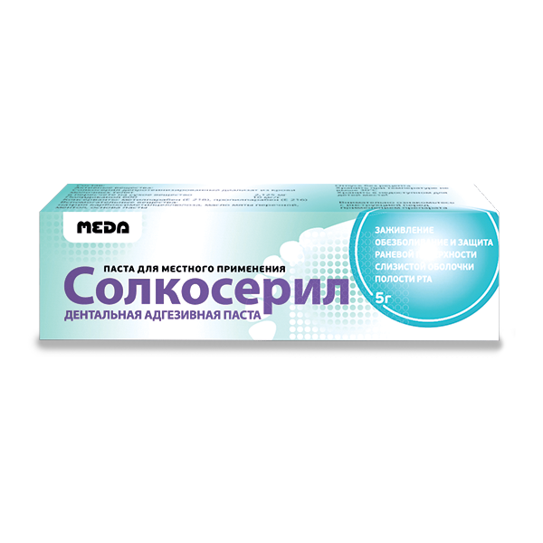 Солкосерил дентальная адгезивная паста образует защитный лечебный слой на пораженной области слизистой оболочки полости рта и предохраняет ее от механических и химических повреждений в течение 3-5 ч, выполняя функцию лекарственной повязки.