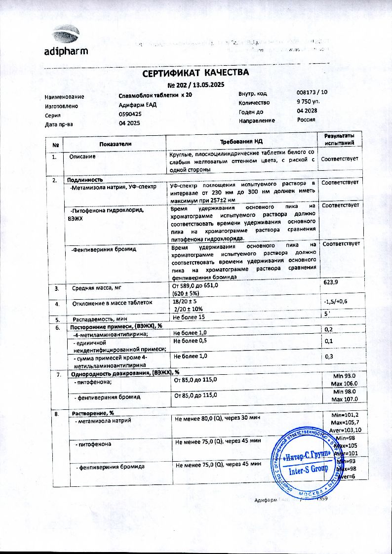 Активные вещества: метамизола натрия моногидрата 527 мг в пересчете на метамизол натрия 500 мг, питофенона гидрохлорида 5,25 мг в пересчете на питофенон 5 мг и фенпивериния бромида 0,1 мг;
