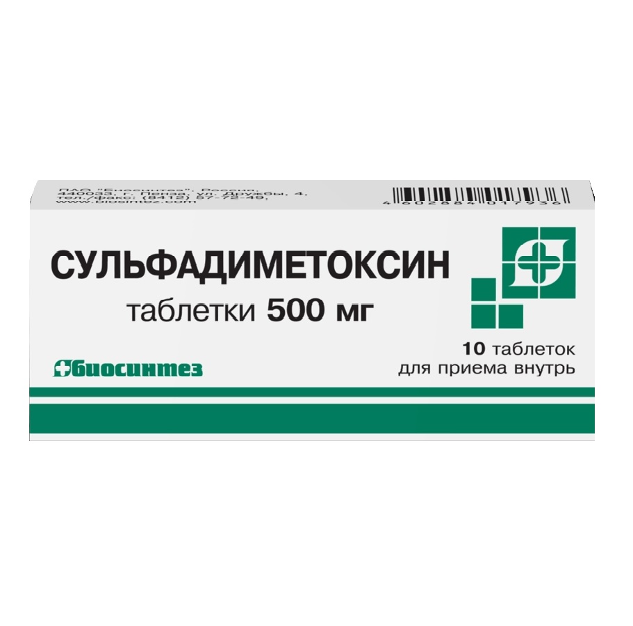 1 таблетка содержит активное вещество: сульфадиметоксин - 200 мг или 500 мг. Вспомогательные вещества: кальция стеарат, желатин, крахмал картофельный.