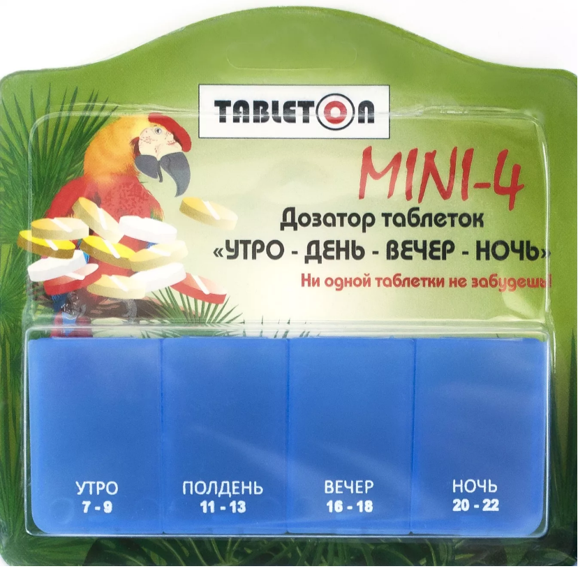 Легко распределяйте и храните таблетки в Таблетон Мини-4. Для вашего удобства на каждой ячейке указано время приема: утро - полдень - вечер - ночь. Контейнеры для таблеток Таблетон производятся в Европе из европейского пластика, что обеспечивает высокое качество готовой продукции.