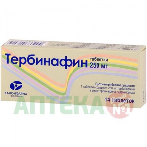 При пероральном приеме хорошо абсорбируется более 70%, абсолютная биодоступность вследствие эффекта первого прохождения снижается на 40%. После однократного приема внутрь в дозе 250 мг время достижения максимальной концентрации (ТСmах) около 2 ч, максимальная концентрация (Сmах) приблизительно 1 мкг/мл. Площадь под кривой концентрация - время (AUC) - 4.5 мкгхч/мл, при одновременном приеме с пищей AUC увеличивается на 20%. При длительном приеме Сmах увеличивается на 25%, AUC - в 2.5 раза. Эффективный период полувыведения (Т1/2) - около 36 ч, терминальный Т1/2 200-400 ч (указывает на длительное выведение из кожи и жировой ткани). Равновесная концентрация (Css) не зависит от возраста. Концентрация тербинафина в плазме не зависит от пола. |