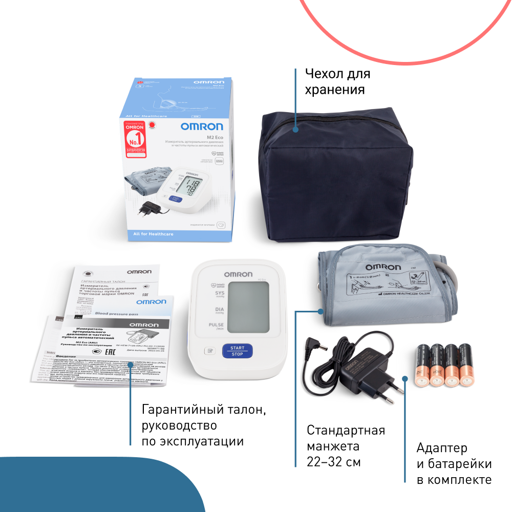OMRON M2 Eco ARU – тонометр автоматический на плечо для измерения давления и частоты пульса. Набор оптимальных функций по доступной цене. Запатентованная технология IntelliSense от компании OMRON Управляет процессом измерения и рассчитывает давление из трех показателей: ЧСС (частоты сердечных сокращений), времени измерения и осцилляции. Благодаря этому процесс измерения и давление в манжете подстраиваются под конкретного пользователя, который может быть уверен в точности полученного результата. Тонометр для давления клинически апробирован. Его датчик давления – главный компонент для измерения артериального давления, производится в Японии. Стандартная веерообразная манжета для тонометра 22–32 см повторяет форму плеча и плотно его облегает. За счет этого давление распределяется по манжете равномерно. Все тонометры для измерения давления OMRON снабжены индикатором аритмии – алгоритмом обнаружения нерегулярного сердцебиения. Если прибор обнаружит при измерении измененный сердечный ритм, он оценит достоверность результатов. В том случае если тонометр не сможет провести измерение, на экране появится значок ошибки, а измерение придется повторить. Если значок аритмии появляется часто, нужно обратиться к врачу. Графический индикатор уровня артериального давления поможет сориентироваться в показаниях и сверить их с отметками о нормах давления. Объем памяти рассчитан на 14 измерений. Тонометр автоматический работает от адаптера переменного тока и также от четырех элементов питания АА (в комплекте), что позволяет держать давление под контролем не только дома, но и на работе, на даче, в поездке. Обслуживание в собственных сервисных центрах в 77 городах России, каждый их которых гарантирует качество предоставления сервисных услуг по ремонту медицинской техники OMRON. Комплектация Электронный блок, манжета компрессионная CM, руководство по эксплуатации, чехол для хранения прибора, комплект элементов питания, адаптер переменного тока, журнал для записи артериального давления, гарантийный талон.