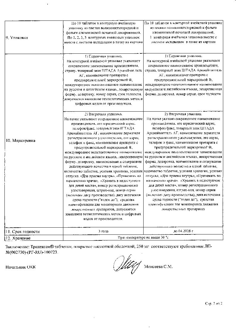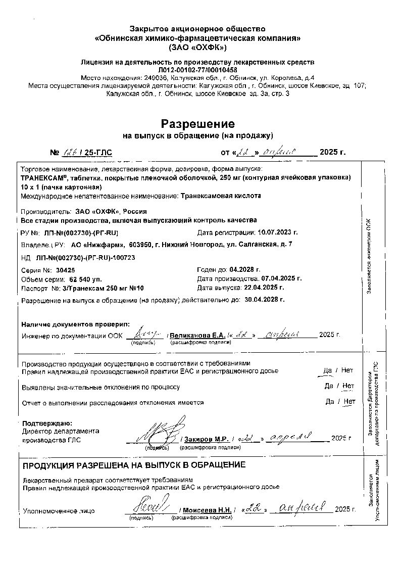 Лечение: антидот неизвестен. При подозрении на передозировку транексамовой кислоты необходима госпитализация. При оказании помощи следует вызвать рвоту, затем провести промывание желудка. Активированный уголь снижает абсорбцию транексамовой кислоты при приеме внутрь в течение первых 1-2 ч после передозировки. Если пациент находится в бессознательном состоянии или при нарушении глотания активированный уголь может быть введен через назогастральный зонд. Рекомендуется прием внутрь или парентеральное введение большого количества жидкости для усиления почечной экскреции, форсированный диурез, контроль количества выделяемой мочи. В некоторых случаях может быть оправданным применение антикоагулянтов.