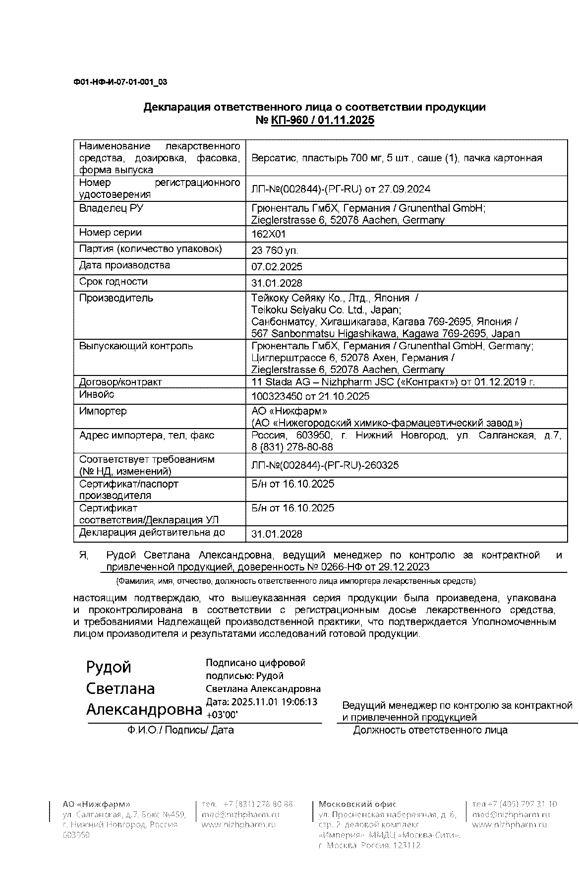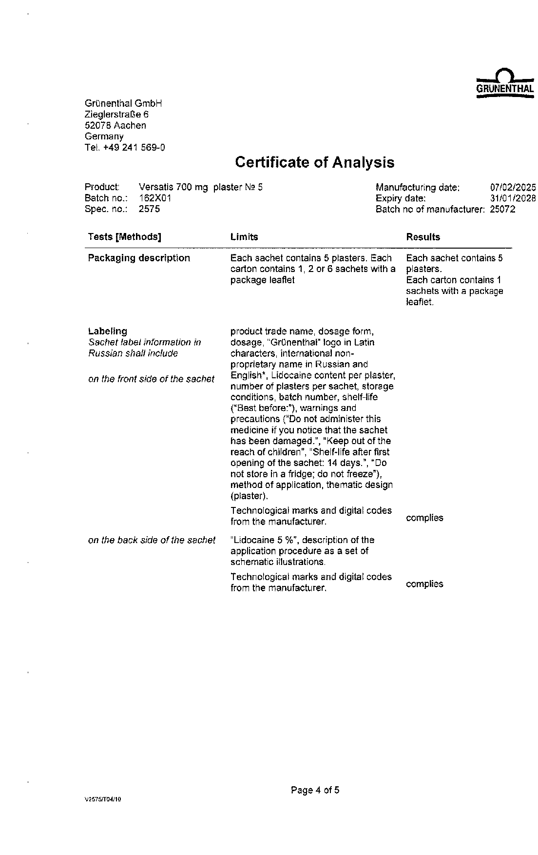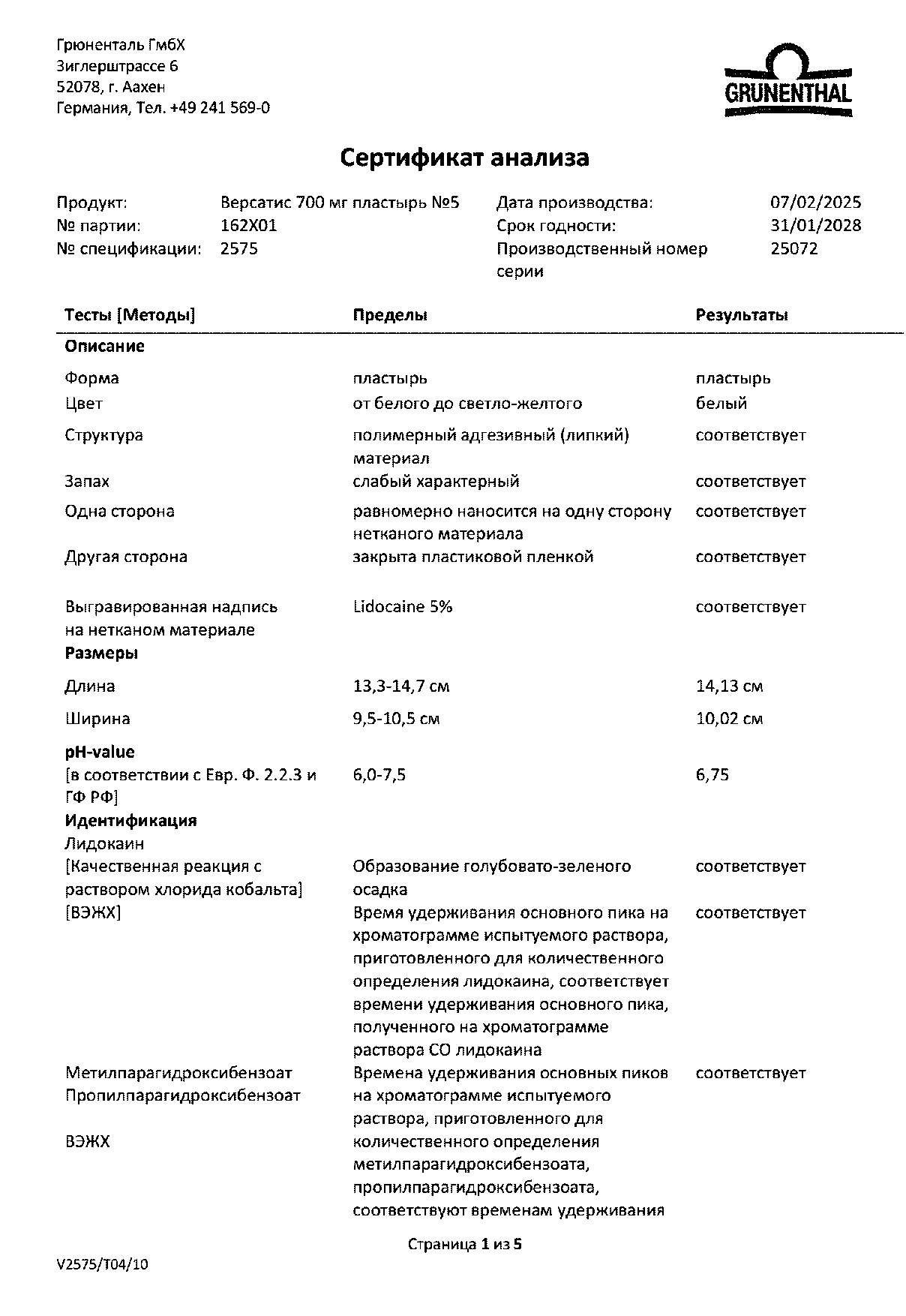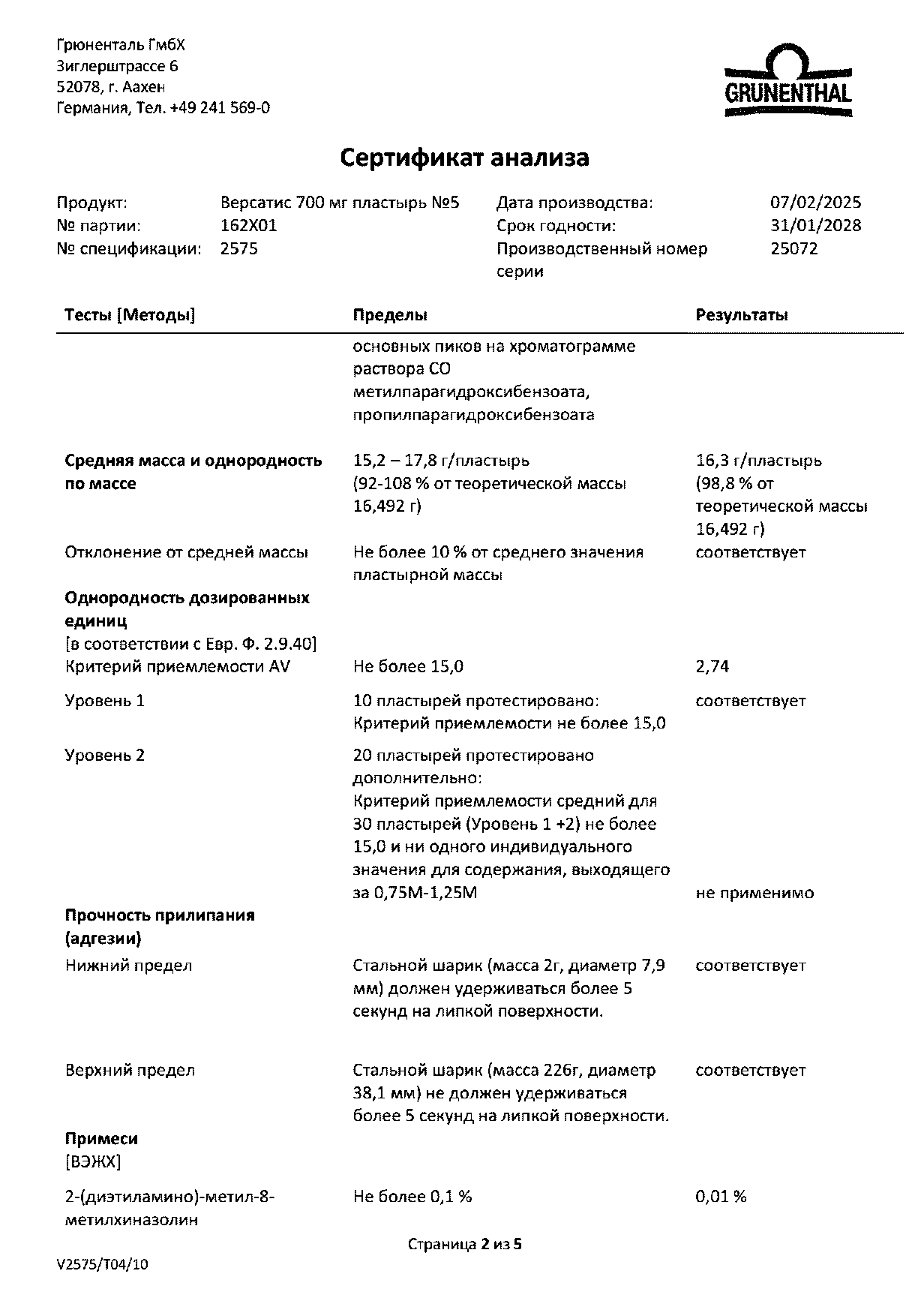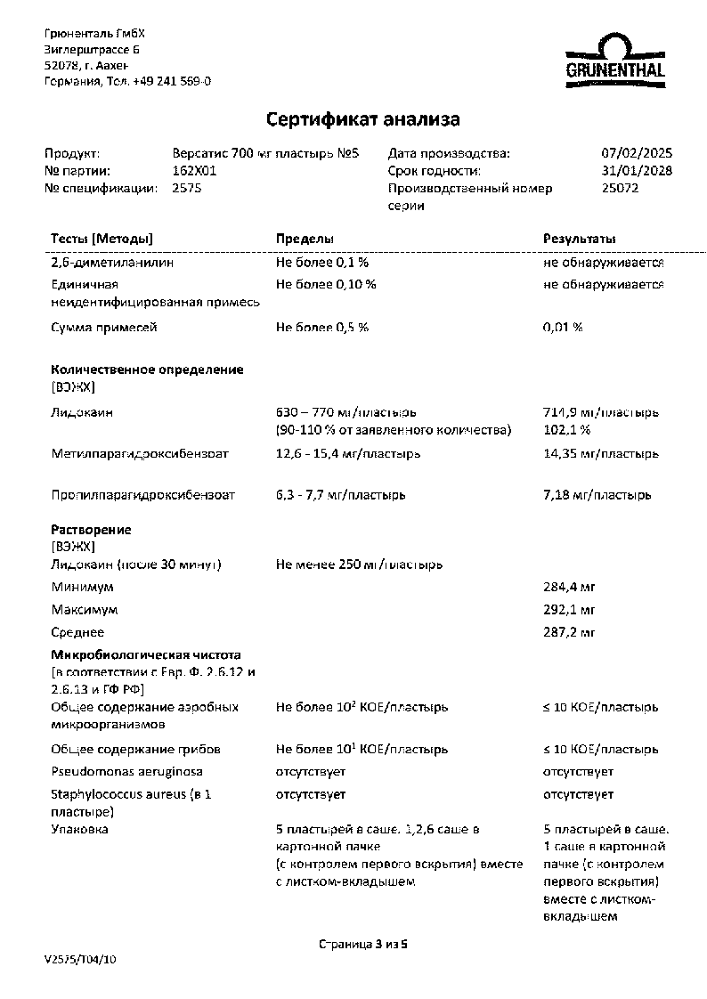 Сертификаты и лицензии “Версатис 5 шт пластырь саше”