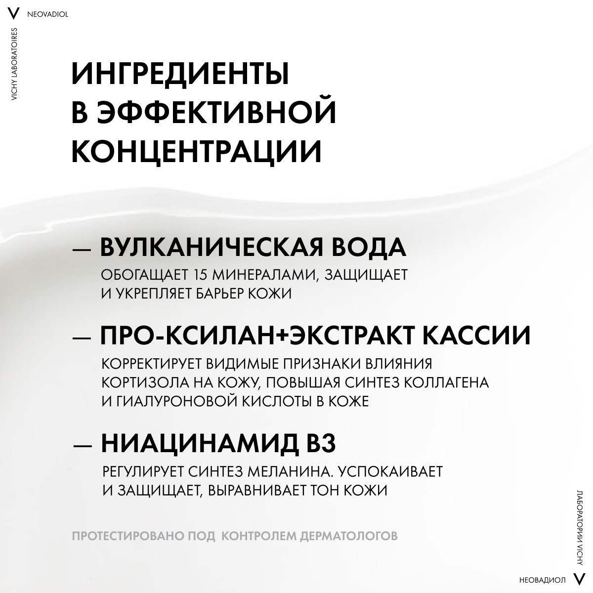 Активные ингредиенты Vichy Neovadiol Crème De Nuit Relipidante Raffermissante активируют механизмы восстановления кожи, компенсируют видимые проявления менопаузы на коже, восполняют потерю собственных липидов, разглаживают морщины и придают коже упругость. Виши Неовадиол Ночной восстанавливающий питательный крем помогает восстановить и сохранить ощущение комфорта на весь день, без труда справляясь с ощущениями сухости и стянутости.