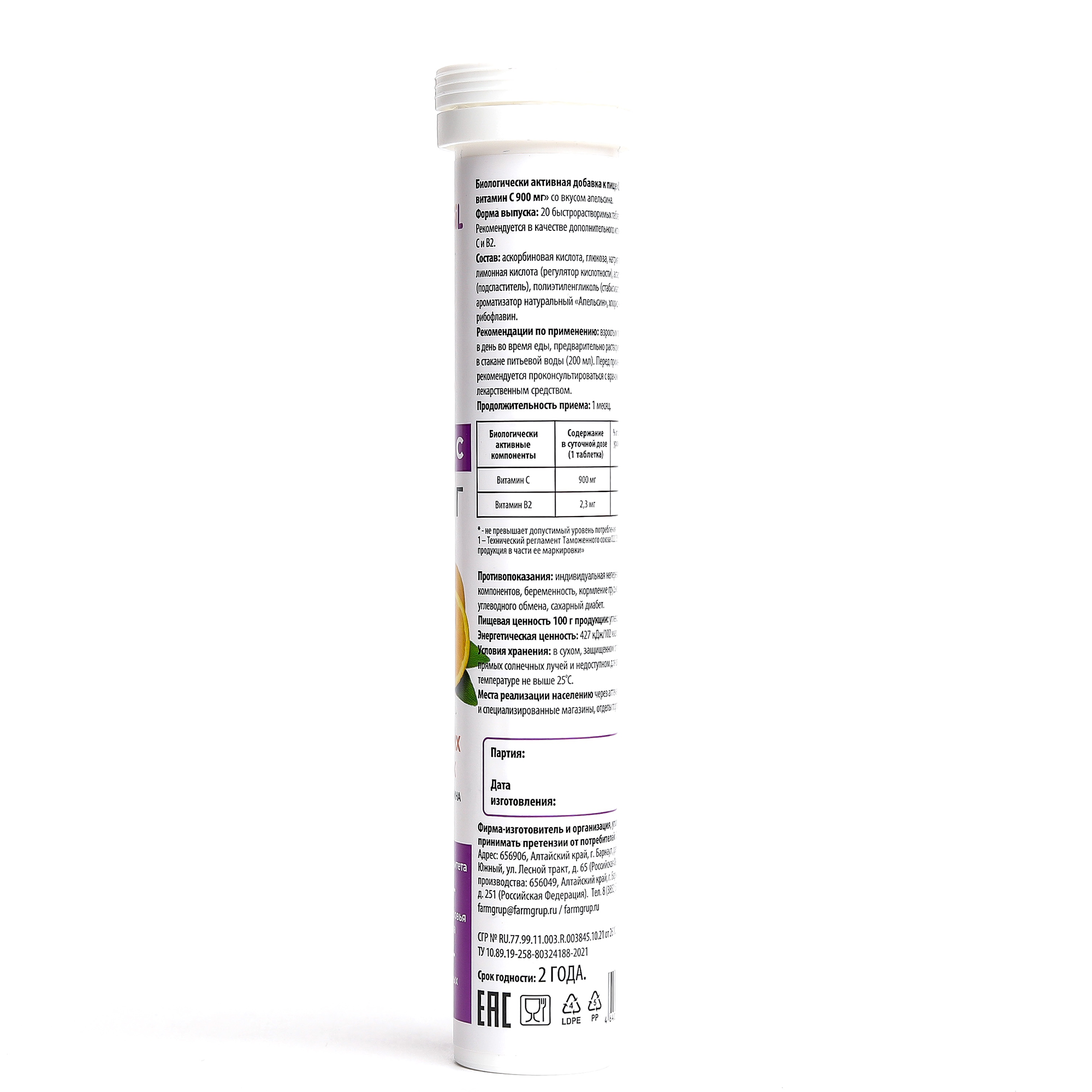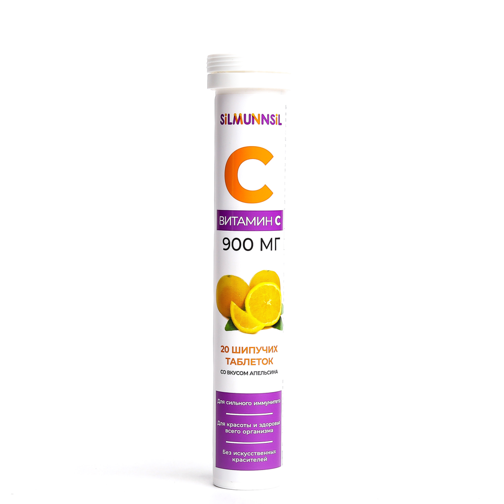 Аскорбиновая кислота, глюкоза, натрия гидрокарбонат, лимонная кислота (регулятор кислотности), аспартам (подсластитель), полиэтиленгликоль (стабилизатор), ароматизатор натуральный "Апельсин", хлорид натрия, рибофлавин.