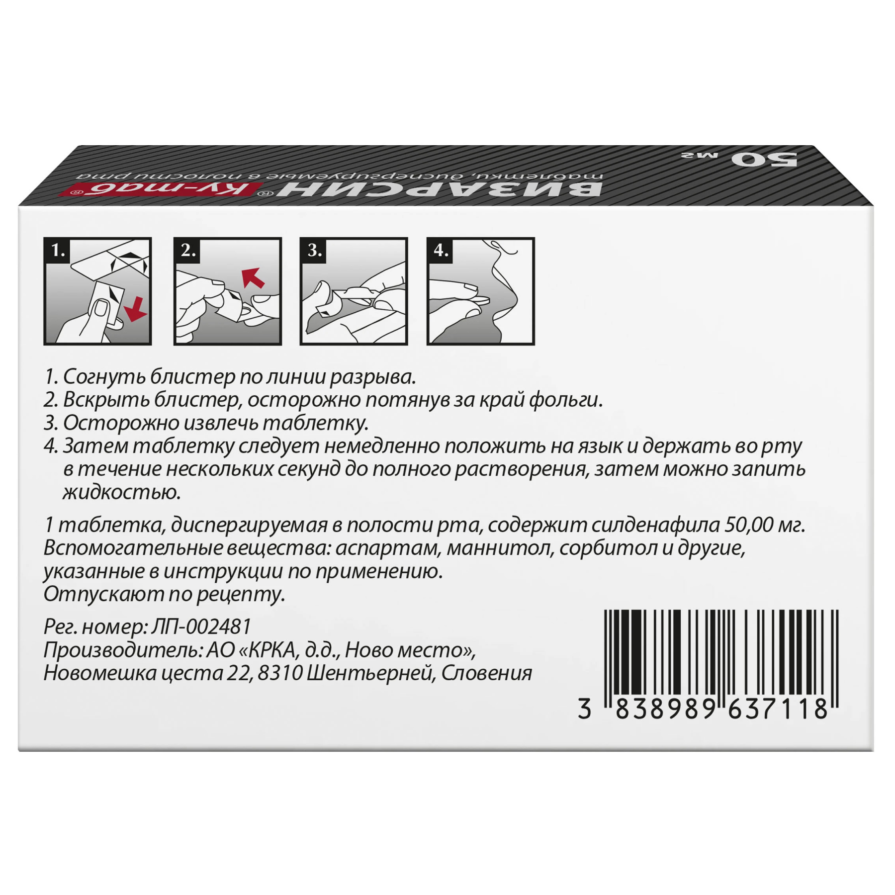 Действующее вещество: силденафила цитрат 70,24 мг (эквивалентно силденафилу 50,00 мг);